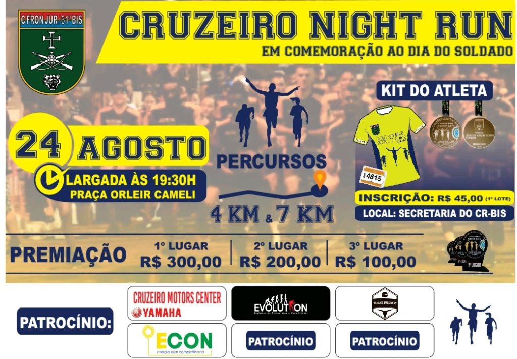 A terceira edição da corrida Night Run, em alusão ao Dia do Soldado, ocorre no dia 24 de agosto em Cruzeiro do Sul. Serão dois percursos 4km e 7km, com largada prevista para as 19h30 na Praça Orleir Cameli.