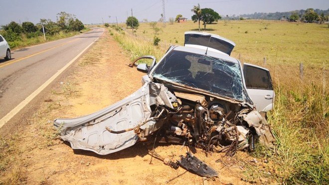 Com a força da batida, a frente do Fiesta foi destruída ao ponto de arrancar o motor. Foi informado que um dos ocupantes foi arremessado para fora, caindo sobre o mato e o demais ficaram dentro do veículo.