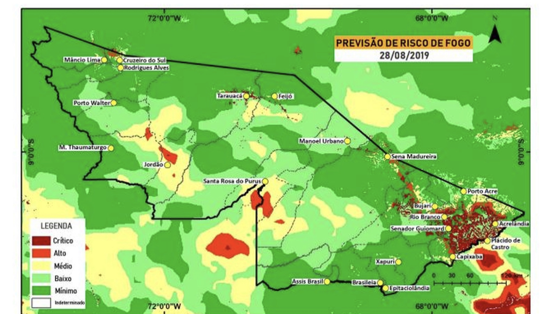 Os números foram divulgados pelo monitoramento de queimadas, nesta terça-feira (27), e são de dia 1º até 27 de agosto. Todos os dados usados no boletim são do Instituto Nacional de Pesquisas Espaciais (Inpe) e mostram que em Feijó foram registrados 579 focos de queimadas. Em Tarauacá 390 e Sena Madureira aparece com 281 focos.