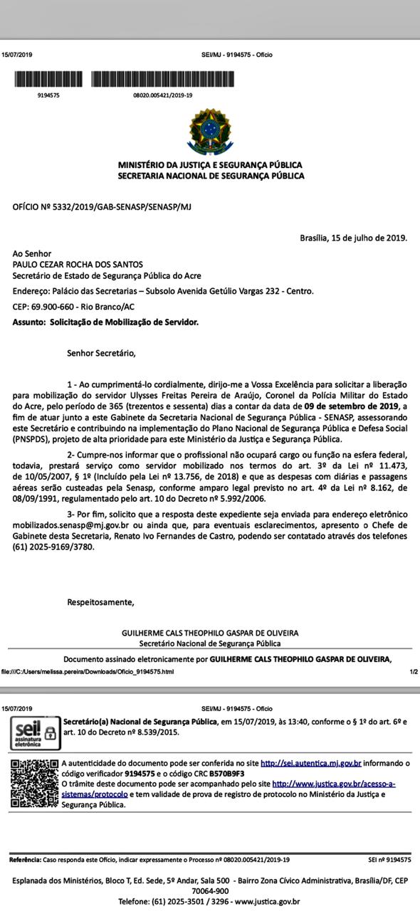 Pela vasta experiência na área, Ulysses, passará a contribuir com a seus conhecimentos técnicos, junta a Secretaria Nacional de Segurança Pública, já a partir do dia 9 de setembro.