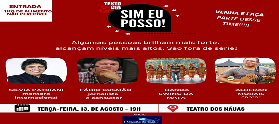 O “Sim Eu Posso” traz à Cruzeiro do Sul, a mentora internacional Silvia Patriani, o jornalista e consultor em estratégias de comunicação Fábio Gusmão e conta com apresentações culturais do cantor Alberan Morais e da Banda Swing da Mata.