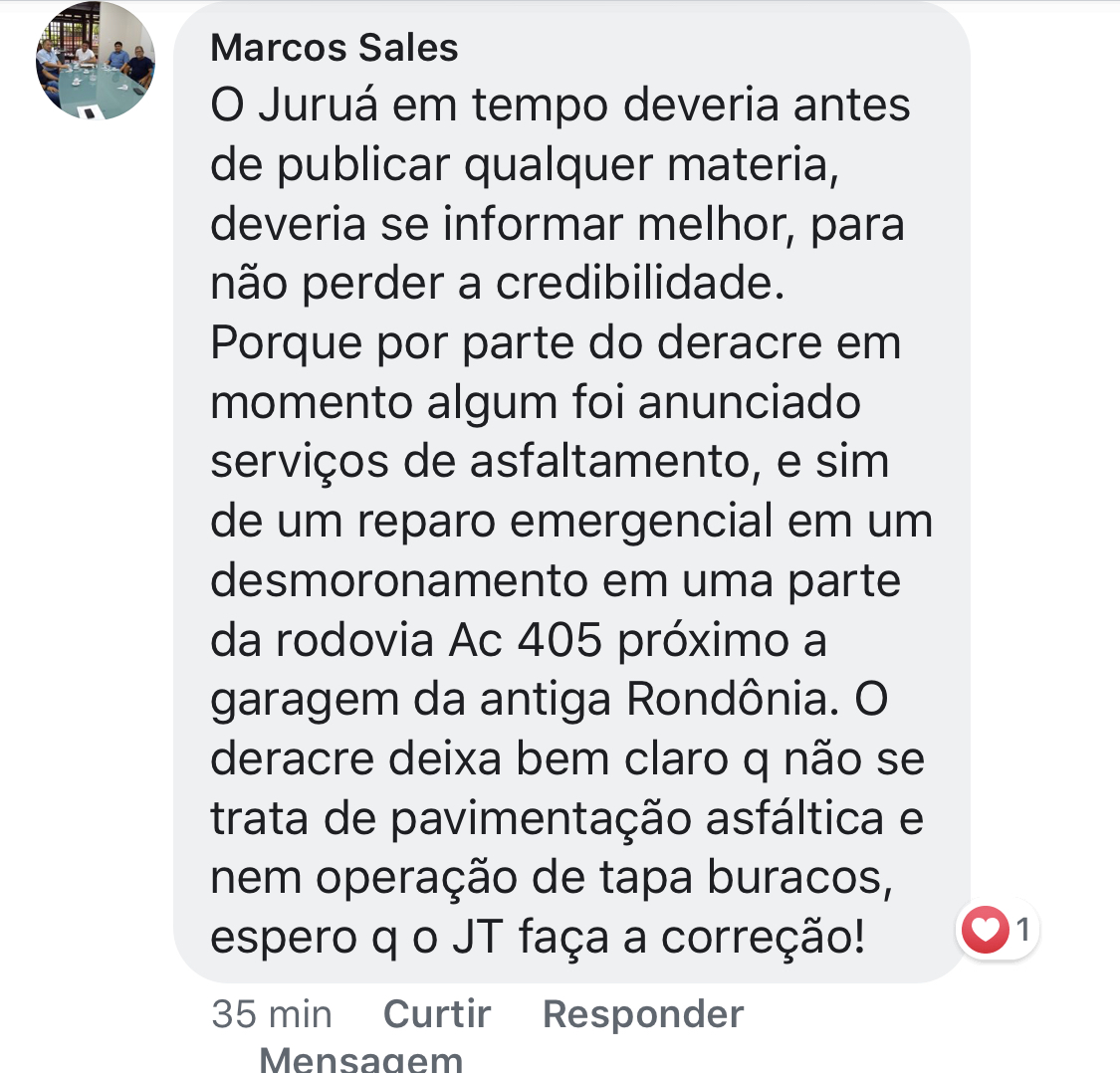 O Juruá em Tempo havia publicado um material referente ao serviço, informando que seria pavimentado parte da rodovia, mas o diretor do Deracre solicitou a correção e informou que não será feito nenhum serviço de asfaltamento, mas sim, um pequeno serviço de reparo. Frustrando a população que se alegrou pensando que haveria melhoria na rodovia.