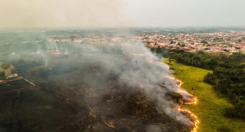 Nas imagens é possível ver a queimada se aproximando a casas e prédios no perímetro urbano de Rio Branco.