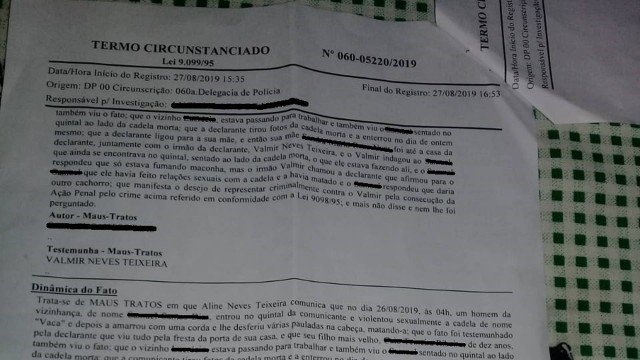 Aline relata que assistiu a cena de dentro de casa, junto com o filho de 10 anos. Segundo ela, o menino correu para chamar ajuda. Quando voltou com o tio, Valmir Neves, o agressor estava sentado ao lado do animal morto. Questionado, o homem disse que tinha entrado no quintal para usar drogas.