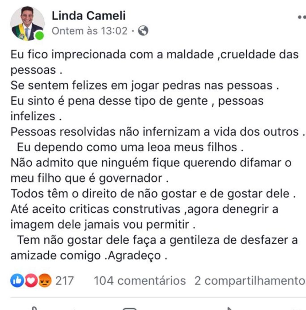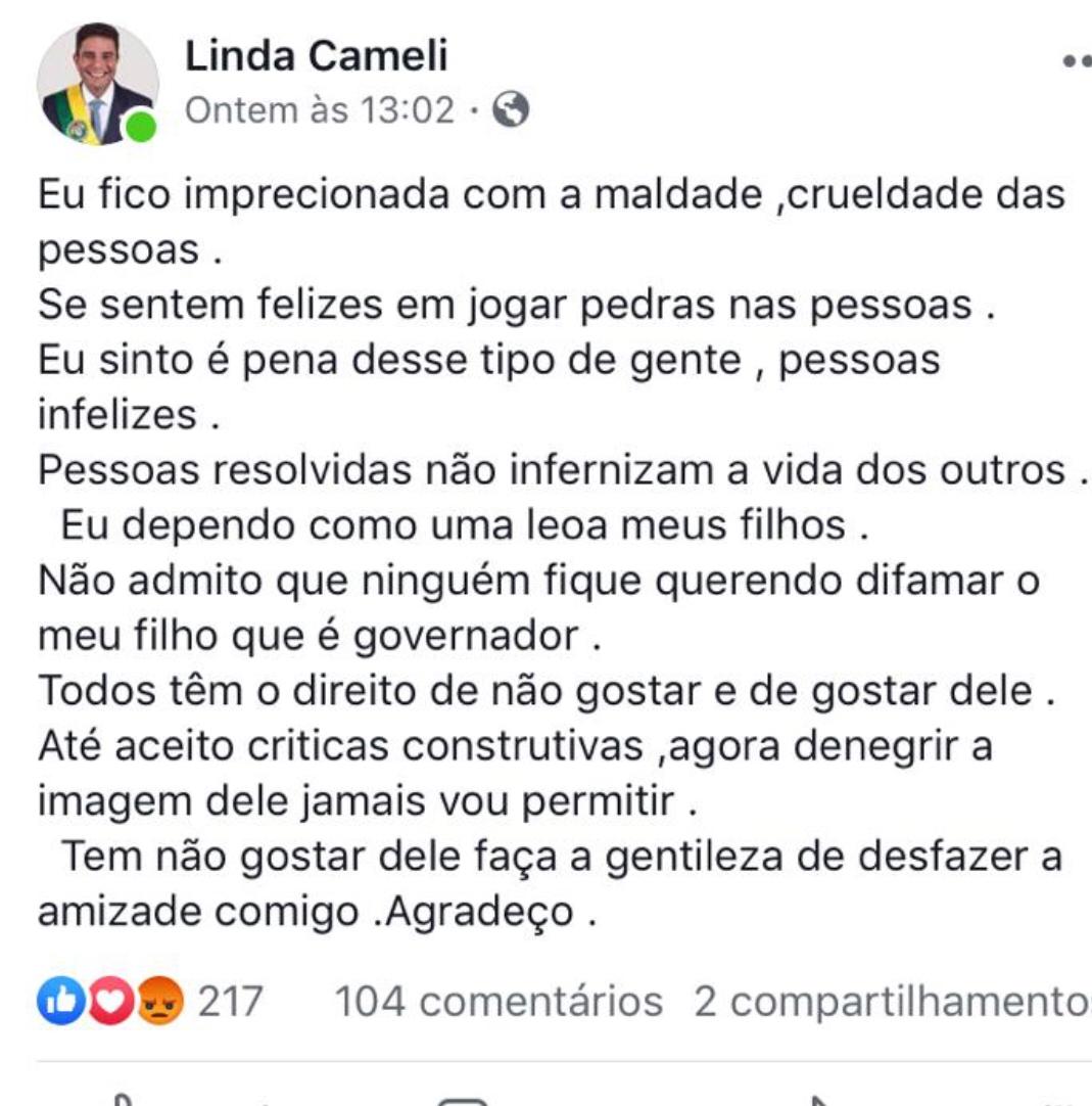 Atuante nas redes sociais, Linda Cameli – mãe do governador Gladson Cameli (PP) – usou o seu Facebook para desabafar sobre as críticas que o filho recebe.