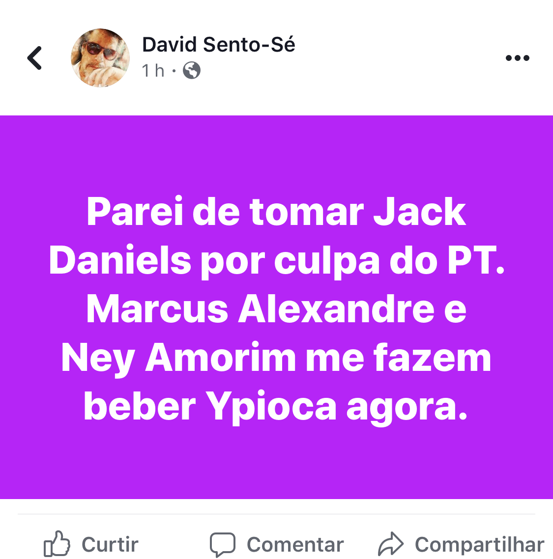 “Parei de tomar Jack Daniels por culpa do PT. Marcus Alexandre e Ney Amorim me fazem beber Ypioca agora” comentou, insinuando um suposto calote.