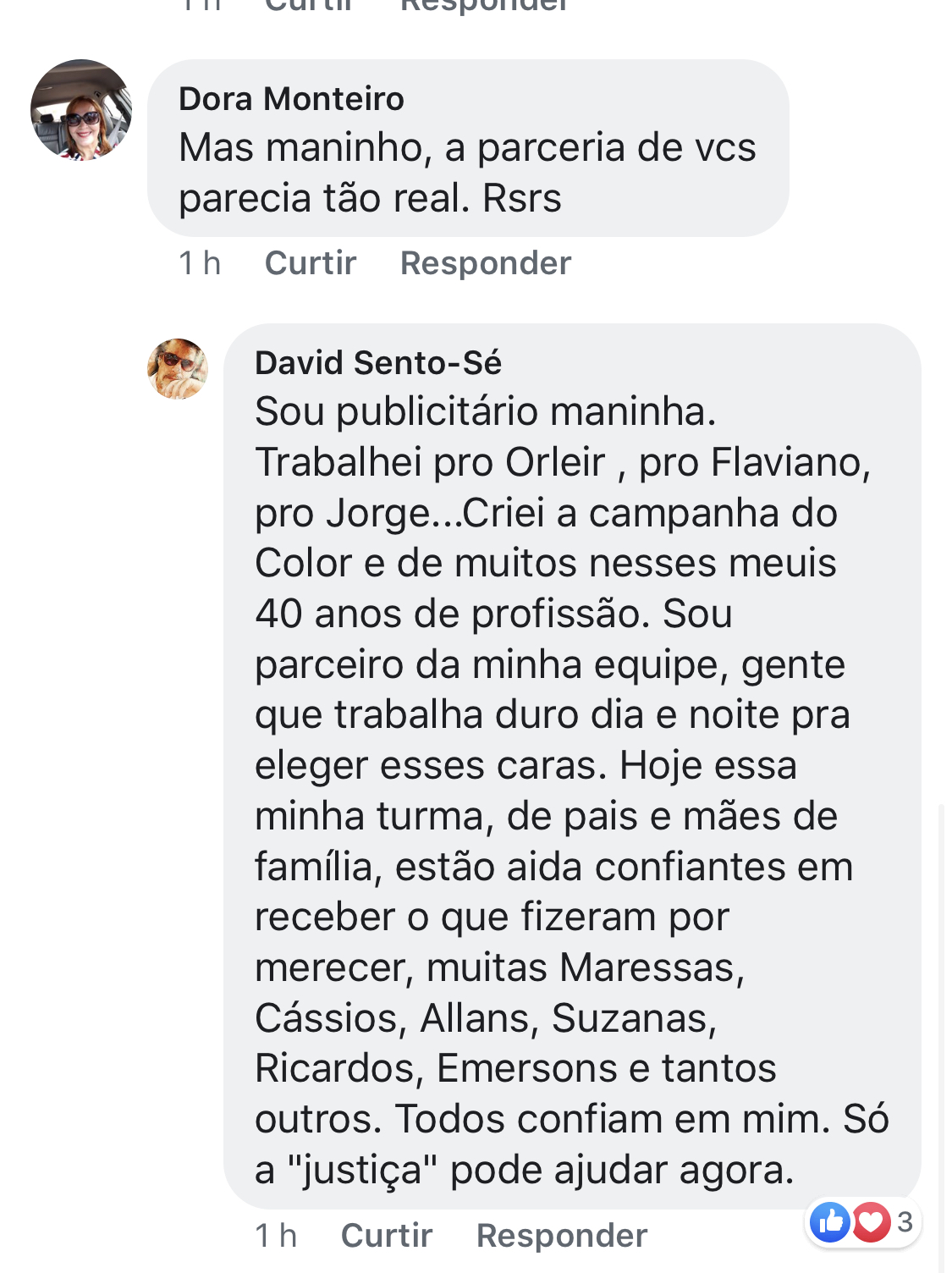“Trabalhei pro Orleir, Flaviano, Jorge… Criei a campanha do Color e de muitos nesses meus 40 anos de profissão. Sou parceiro da minha equipe, gente que trabalha duro dia e noite para eleger esses caras. Hoje essa minha turma, de pais e mães de família, espera receber o que fizeram por merecer. Todos confiam em mim. Só a “justiça” pode nos ajudar agora”, disse o publicitário.