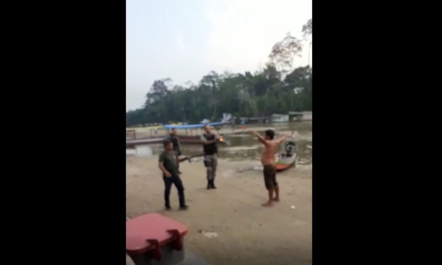 O freteiro José Francisco, conhecido como Pantico, foi alvo de um disparo à queima roupa, por munição de borracha, durante uma bebedeira na praia de Jordão (AC), neste domingo. O rapaz, segundo testemunhas, estava apanhando de outros frequentadores e cobrou providências da polícia. Dois militares se aproximara e um deles efetuou o disparo (veja no vídeo abaixo) a curta distância. Familiares de Francisco, que estava na praia acompanhado da irmã menor, enviaram as imagens ao acjornal acreditando que os policiais foram truculentos, pois a vítima abriu os braços em sinal de rendição antes de ser alvejado. Após o tiro, Francisco, no chão e sem oferecer resistência, foi imobilizado por meios agressivos. Um dos PM´s pisou na cabeça do rapaz. Com um hematoma no rosto e a bala alojada na barriga, ele foi levado para o hospital e, em seguido, para uma cela da delegacia da cidade. O delegado liberou o rapaz apenas para o exame de corpo de delido. Francisco vai permanecer preso. “Eu sei que meu irmão estava alterado, mas ele se rendeu quando viu os policiais e não resistiu. Não precisavam fazer aquilo. A barriga dele tem um buraco por causa da bala e foi preciso costurar. Tenho medo de não soltarem mais ele”, disse uma outra irmã.