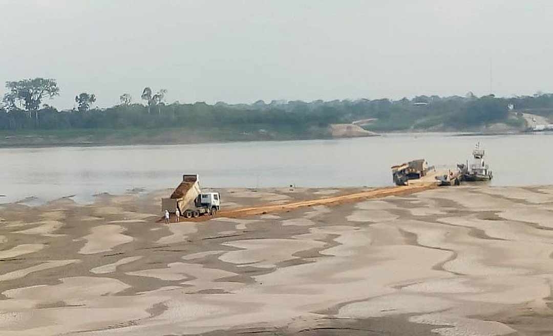 A dificuldade de travessia das balsas que transportam veículos de um lado para o outro no rio Madeira, em Rondônia, por causa da seca no manancial, obrigou a empresa de navegação responsável pelo transporte fluvial a construir um acesso de 200 metros sobre um enorme banco de areia formado após a baixa do nível do rio.