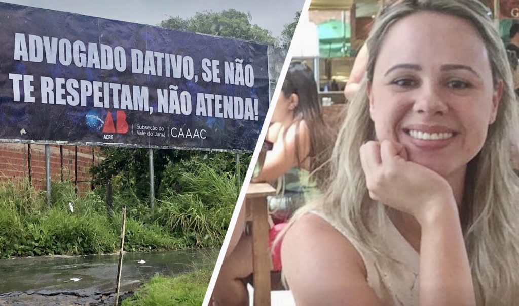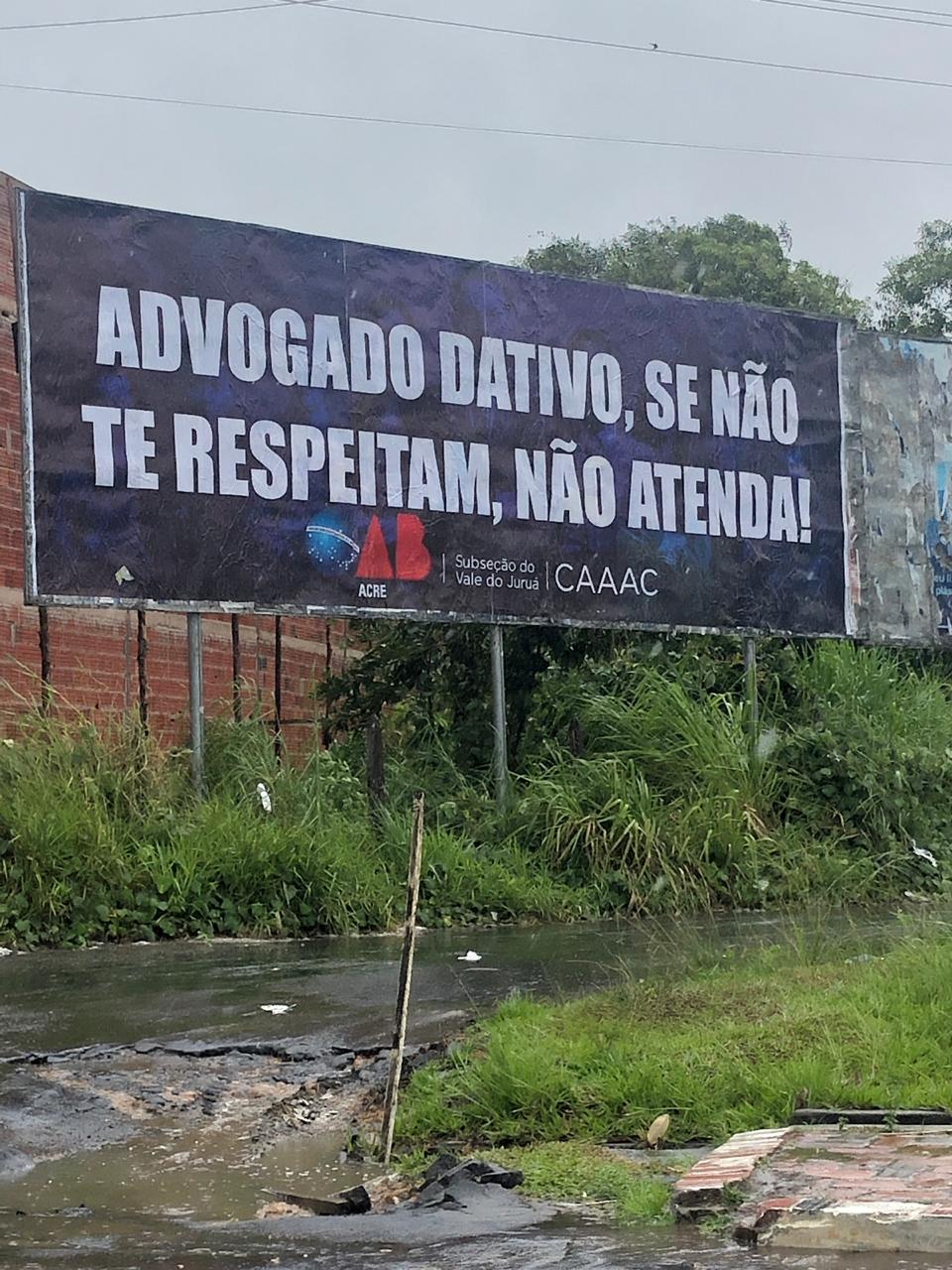 “Advogado dativo, se não te respeitam, não atendam”. Essa é a frase de um outdoor colocado próximo à casa da juíza da Vara da fazenda Pública, Evelin Campos Cerqueira Bueno, próximo ao Hospital do Juruá, em Cruzeiro do Sul.