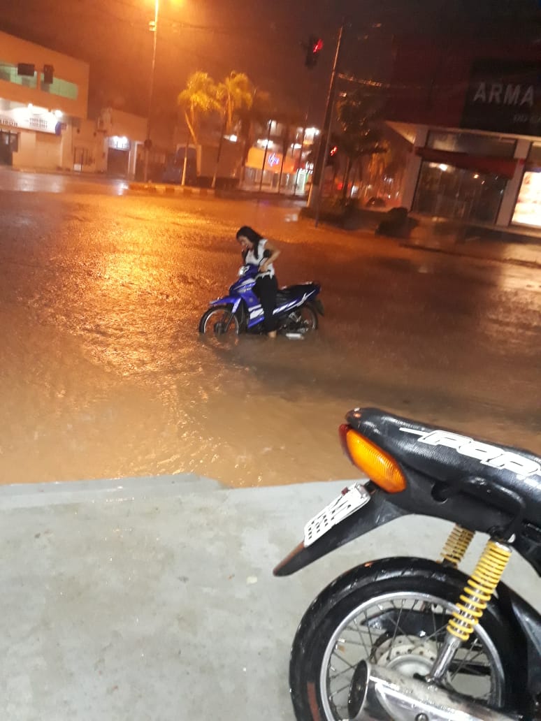 Na região central da cidade, as alagações foram intensas. Pelo visto, sem nenhum tipo de ajuda, uma mulher foi flagrada tentando retirar uma motocicleta do meio da rua, tomada pelas águas.