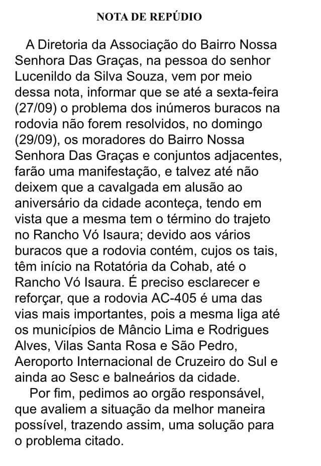 A diretora da Associação dos Moradores do Bairro Nossa da Glória emitiu nota reclamando dos buracos na rodovia AC-405 e que, em decorrência disso, planejam uma manifestação durante o evento.