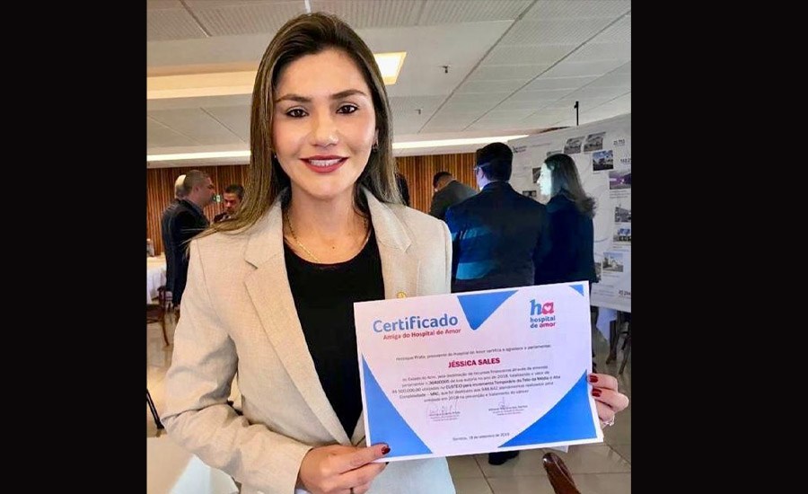 A deputada federal Jéssica Sales (MDB) foi uma das autoridades políticas condecoradas na última semana pela diretoria do Hospital de Amor em Barretos com o certificado “Amigos do Hospital de Amor”, devido sua contribuição com os investimentos e manutenção da rede hospitalar em 2018.