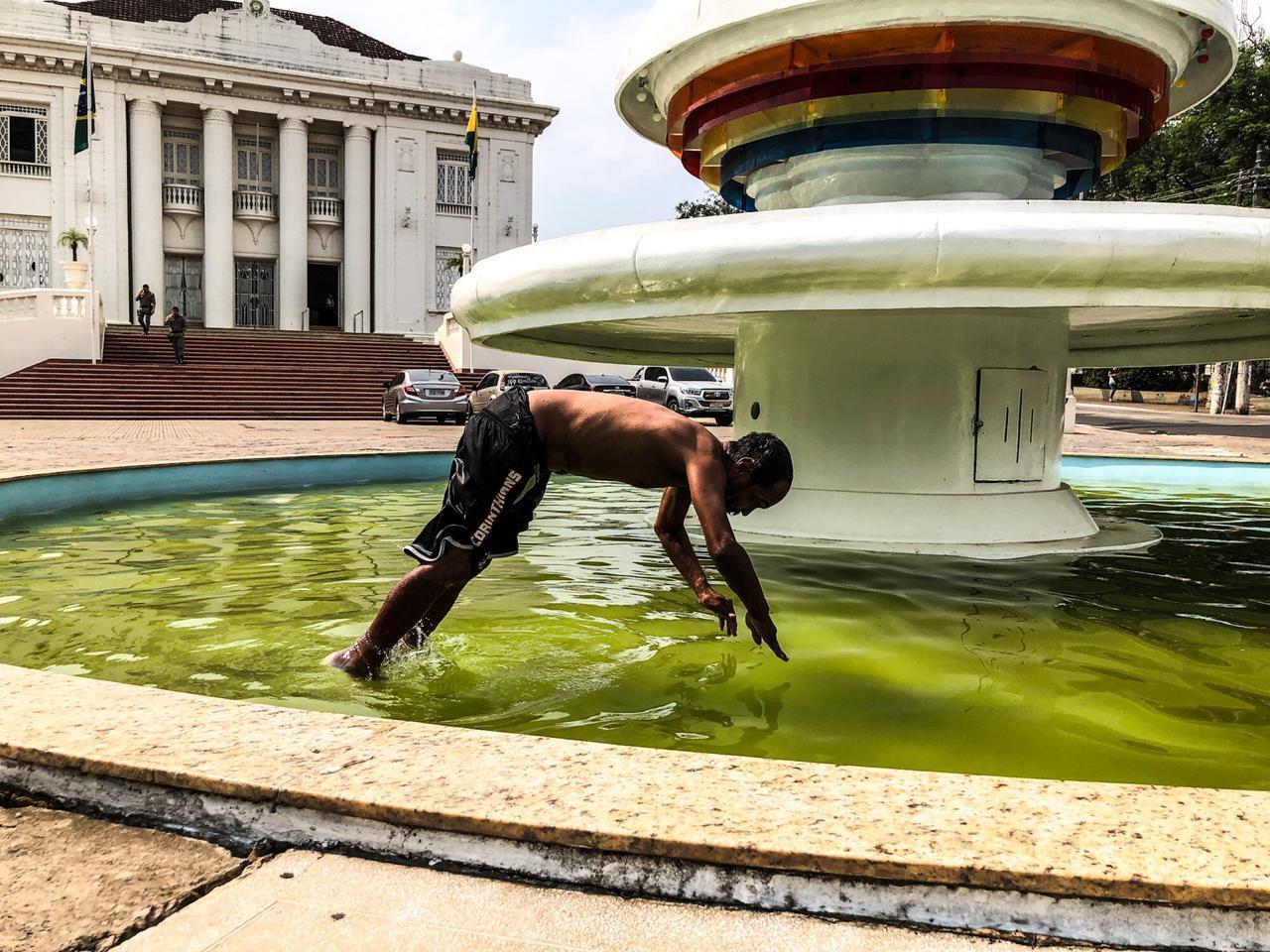 Exemplo captado pelas lentes do fotógrafo Sérgio Vale, onde um dos mais conhecidos moradores de rua de Rio Branco que sobrevive estacionando carros na área próxima a Assembleia Legislativa, aproveitou para se banhar nas águas da Fonte.