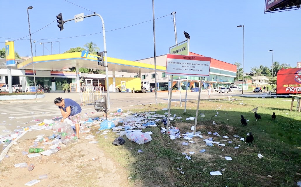 Quem passou pela avenida logo cedo percebeu a grande quantidade de lixo deixada no local. Dona Fátima, de 66 anos, aproveitou para coletar garrafas pets para reciclar e ganhar um dinheiro extra.