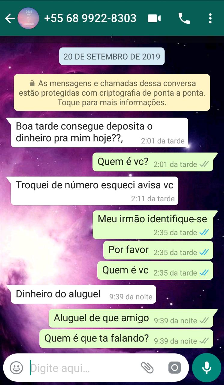 Mensagens estão sendo enviadas para contatos de telefone, de algumas pessoas em Cruzeiro do Sul. Os criminosos se passam por um dos amigos da vítima e, através da conversa, fingem precisar de ajuda para fazer um depósito ou transferência de dinheiro em conta bancária, e alguns cobram inclusive aluguel.