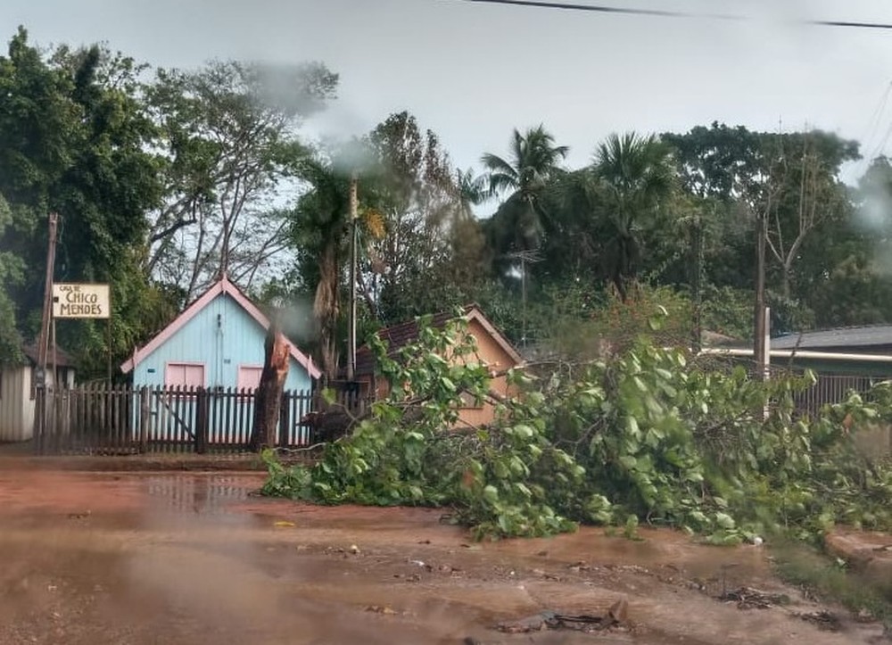 Um forte temporal atingiu a cidade de Xapuri, interior do Acre, no início na tarde desta quarta-feira (11). O vendaval derrubou uma árvore de mais de 10 metros plantada em frente à casa do seringueiro e ambientalista Chico Mendes.