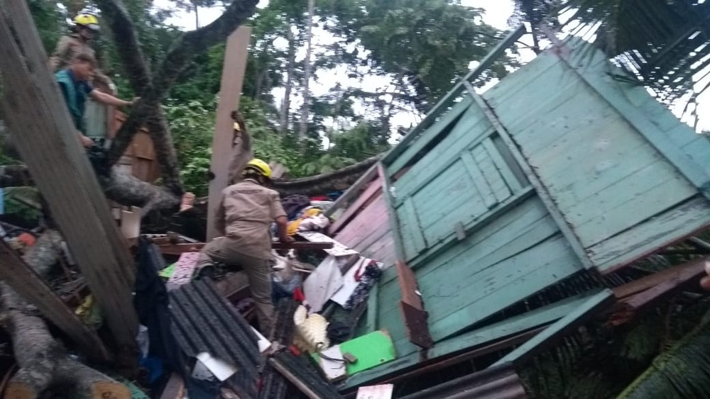 Uma casa de madeira ficou completamente destruída ao ser atingida por um árvore de médio porte durante o temporal desta quinta-feira (24) no bairro São Francisco, em Rio Branco.