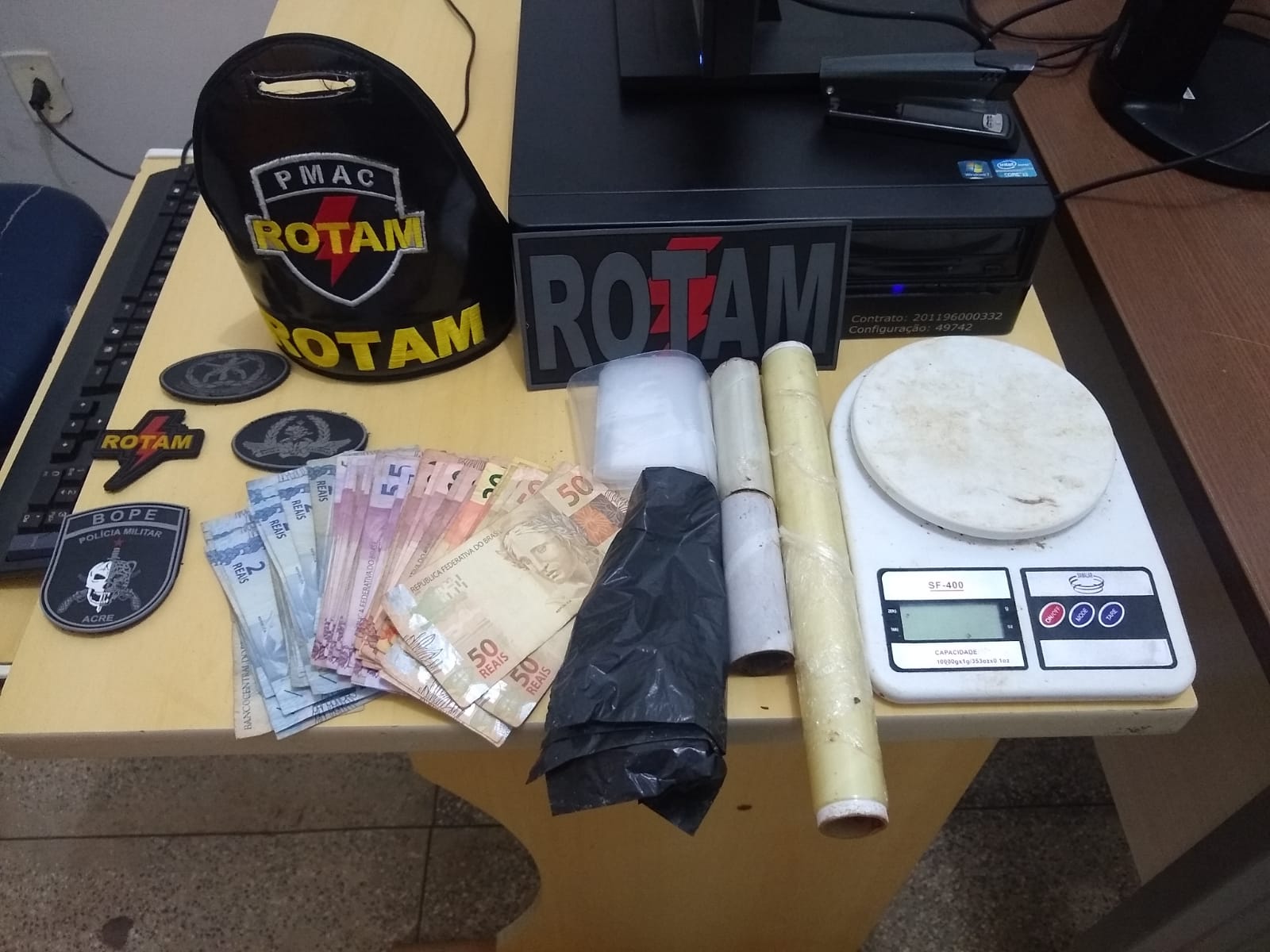 Com os dois a polícia apreendeu 20 tabletes de substância que aparenta ser maconha, 61 trouxinhas de cocaína, 51 trouxinhas de pasta base de cocaína, uma balança de precisão e R$ 1.043,00 em dinheiro.
