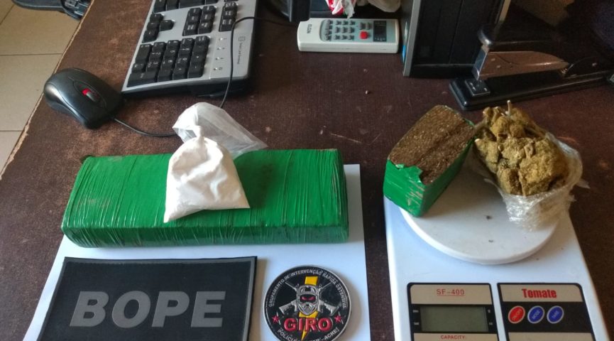 Um pacote de cocaína com 40 gramas, um pacote de Skank de 83 gramas e um tijolo e meio de maconha pesando 1 kg foram capturados.