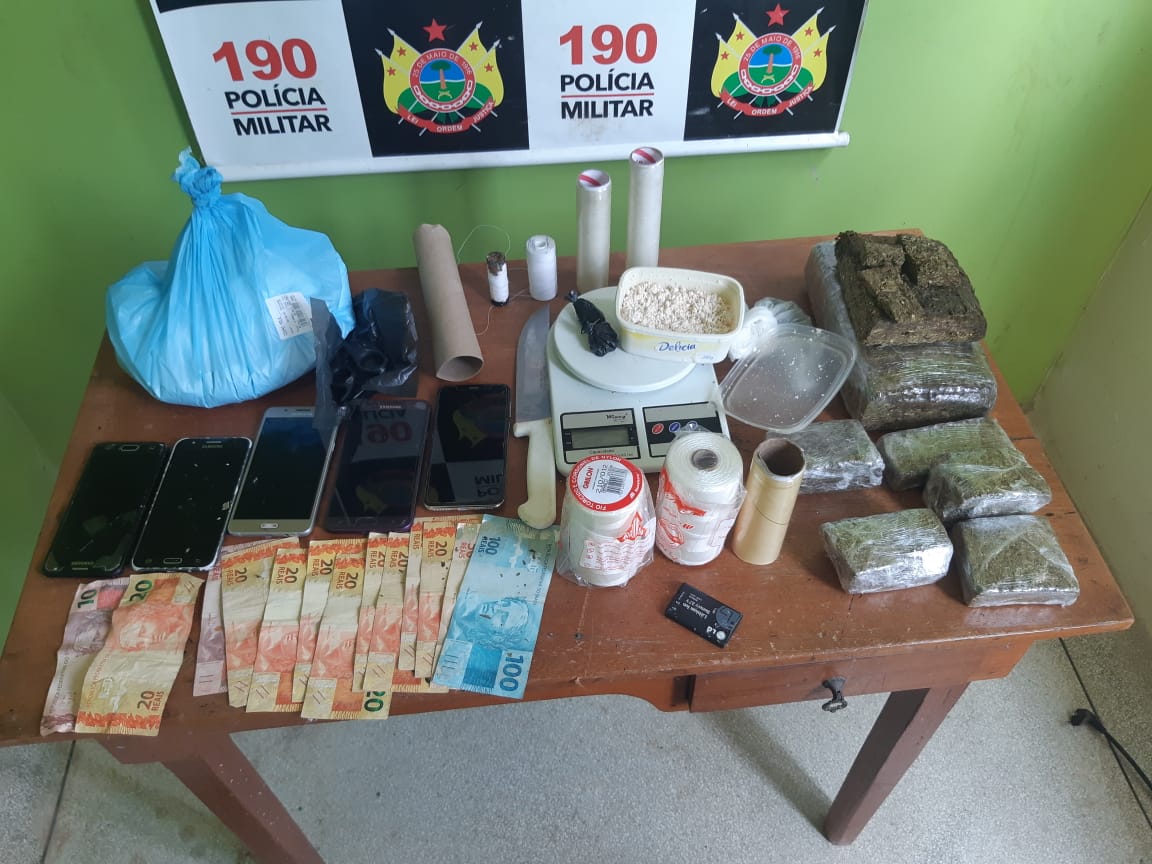 Em operação realizada nesta quarta feira (16), no Bairro da Praia, região conhecida como Campo do Luiz Madeiro, a Policia Militar prendeu vários jovens acusados de tráfico de drogas, além de dinheiro, maconha, pasta à base de cocaína, material para embalagem de drogas, celulares e outros bens de uso pessoal de origem duvidosa. Numa das residências havia plantação de pés de maconha.