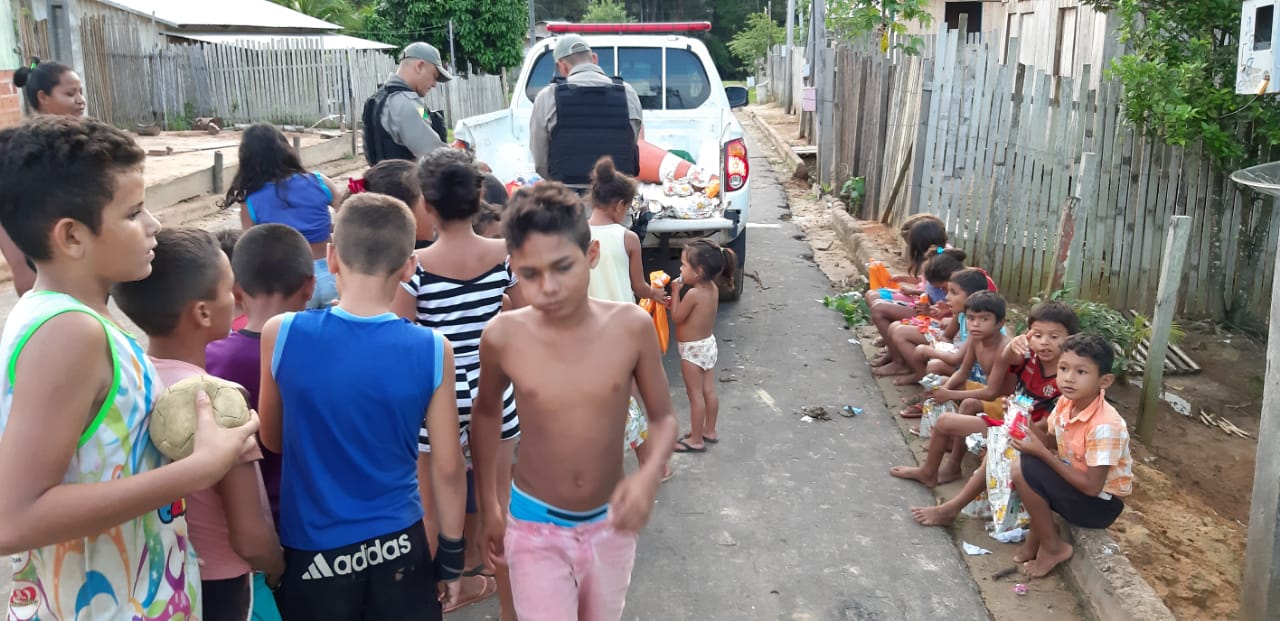 A Polícia Militar do Acre, através do 6°BPM, no último sábado, 12, através do pelotão Ambiental, esteve distribuindo brinquedos e bombons para crianças na comunidade Vila Lagoinha, na BR 364, em alusão ao Dia das Crianças.