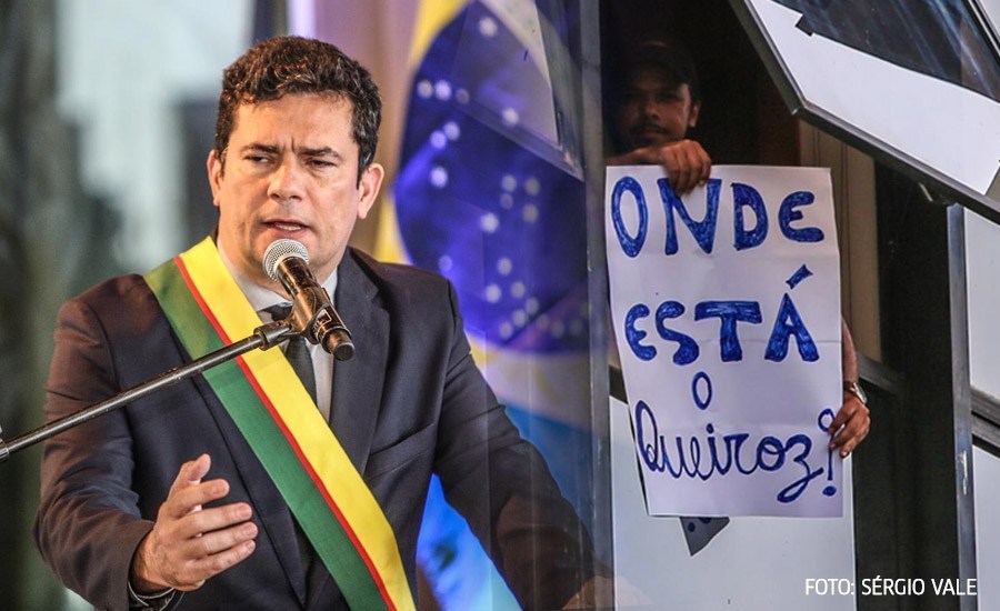 Uma cartaz exposto com os dizeres “Onde Está o Queiroz?” Foi exposto em uma das janelas do terceiro andar da Assembleia Legislativa no início da tarde desta segunda-feira, 18, durante o ato solene em que o Ministro da Justiça, Sérgio Moro, recebia a Ordem da Estrela do Acre, a maior honraria do Estado concedida a uma autoridade.