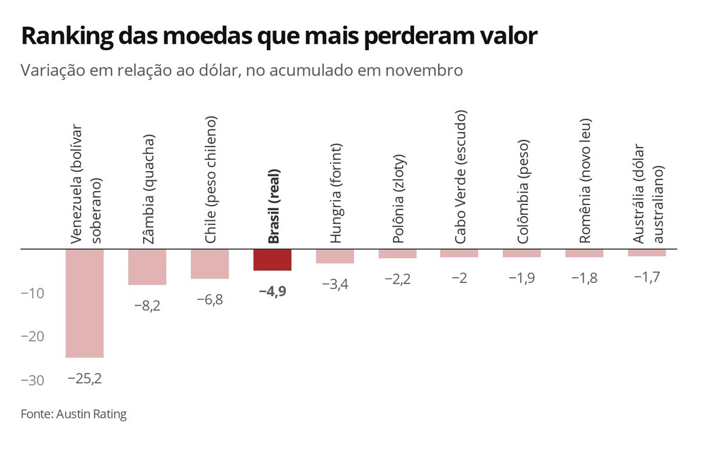 Na véspera, o dólar fechou em alta de 0,5%, a R$ 4,2129. O recorde anterior de fechamento havia sido atingido na semana anterior, quando a moeda encerrou a sessão cotada a R$ 4,206. Na parcial de novembro, acumula alta de 5,07% sobre o real. No ano, o avanço até agora é de 8,74%.
