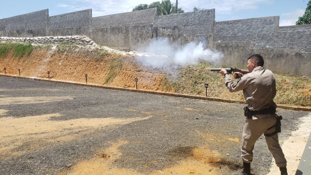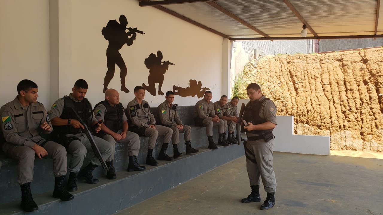 As guarnições do Ronda Ostensiva Tático Móvel (ROTAM), da Companhia de Operações Especiais, participam de uma capacitação para operar com instrumentos de menor potencial ofensivo.