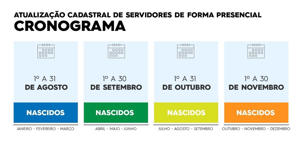 Em novembro, devem realizar a atualização cadastral os servidores nascidos em outubro, novembro e dezembro. O prazo se encerra no dia 29. Caso os servidores que estão com salários bloqueados não compareçam ao RH, vai ser aberto processo administrativo disciplinar.