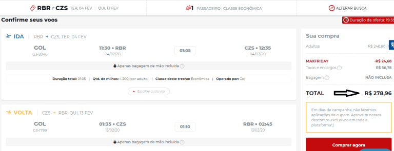 As companhias Gol e LATAM incluíram os destinos do Acre na Black Friday de passagens aéreas com ótimos preços. Além dos descontos especiais, nesta promoção é possível parcelar os bilhetes em até 12 vezes sem juros. Nos voos diretos da Gol entre Rio Branco e Cruzeiro do Sul a ida e a volta custam nesta promoção apenas R$ 278,96, valor com todas as taxas incluídas. São dezenas de opções de passagens aéreas baratas entre as duas cidades. (Confira na imagem abaixo).