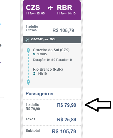 As companhias Gol e LATAM lançaram neste final de semana mais uma promoção na Black Friday antecipada. Nos voos de Rio Branco para Cruzeiro a ida ou a volta, sem a taxa de embarque, custa apenas R$ 79,90. (Veja na imagem abaixo). A ida e a volta custam R$ apenas R$ 261,13 para viagem no início de fevereiro de 2020. Quem está em Cruzeiro do Sul pode aproveitar essa promoção para viajar para Rio Branco pagando o mesmo valor. As taxas de embarque estão incluídas.