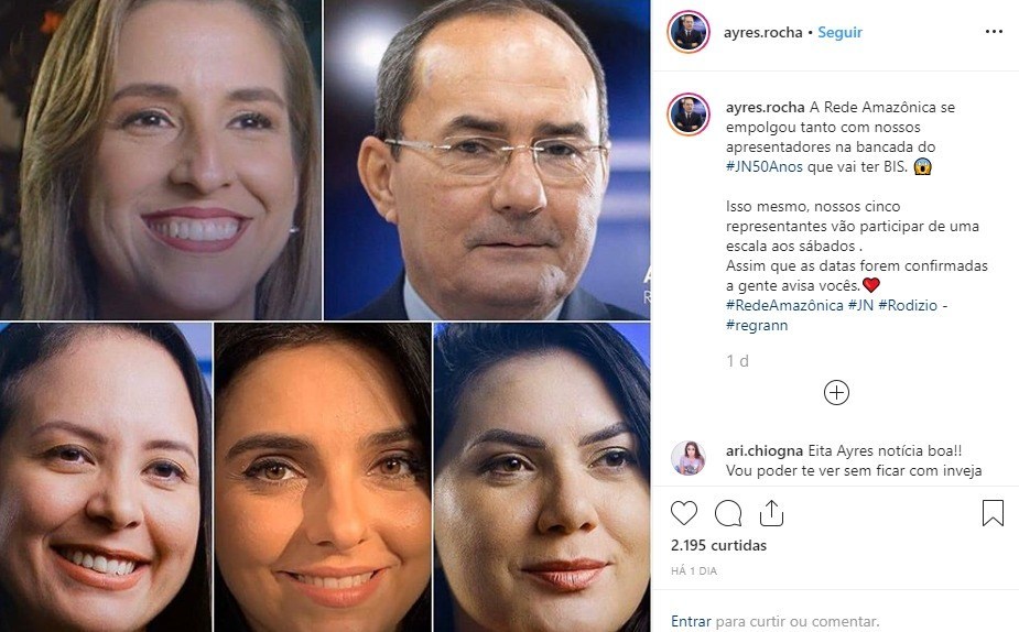 De acordo com publicação do jornalista em seu perfil no Instagram, a TV Globo irá confirmar nos próximos dias um rodízio com apresentadores do Norte. “A Rede Amazônica se empolgou tanto com nossos apresentadores na bancada do #JN50Anos que vai ter BIS. Isso mesmo, nossos cinco representantes vão participar de uma escala aos sábados. Assim que as datas forem confirmadas a gente avisa vocês”, diz o texto.