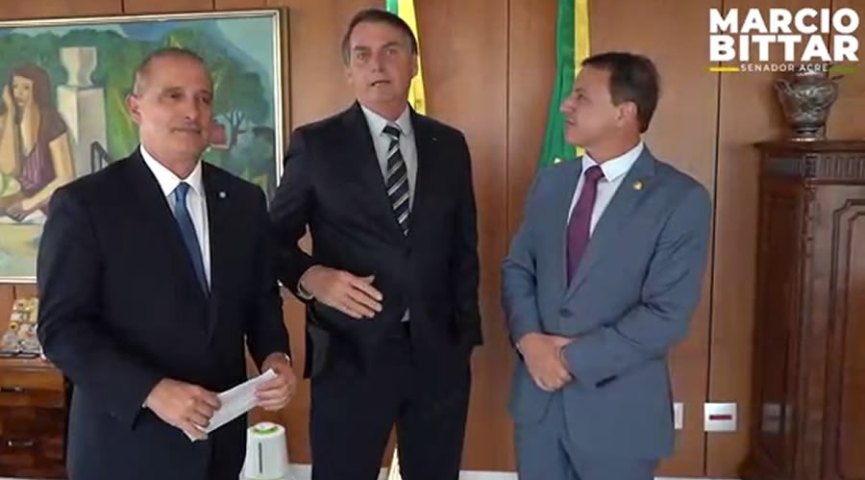 O presidente da República, Jair Bolsonaro, gravou nesta terça-feira (10) um vídeo com o senador Marcio Bittar (MDB-AC) e o ministro-chefe da Casa Civil, Onyx Lorenzoni, no qual reafirma o compromisso do seu governo com o projeto de integração do Acre ao Peru, via BR-364.