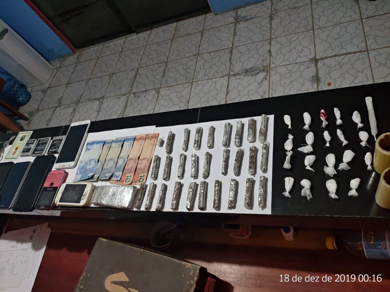 Porém, no caminho para a delegacia, os policiais perceberam o nervosismo de Matheus e decidiram ir até a residência onde o jovem mora. Com a autorização do pai, os policiais revistaram o quarto dele onde encontraram grande quantidade de maconha, cocaína, R$ 28 em espécie, seis celulares e três baterias de celular. O jovem foi preso em flagrante por tráfico de drogas.
