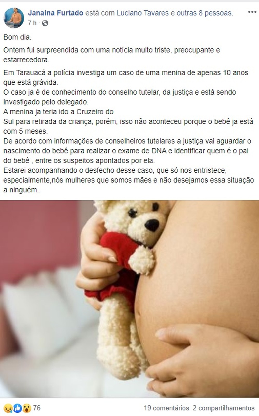 A história veio à tona depois de uma postagem da vereadora de Tarauacá Janaína Furtado (Rede). “Estarei acompanhando o desfecho desse caso que só nos entristece”, escreveu ela.