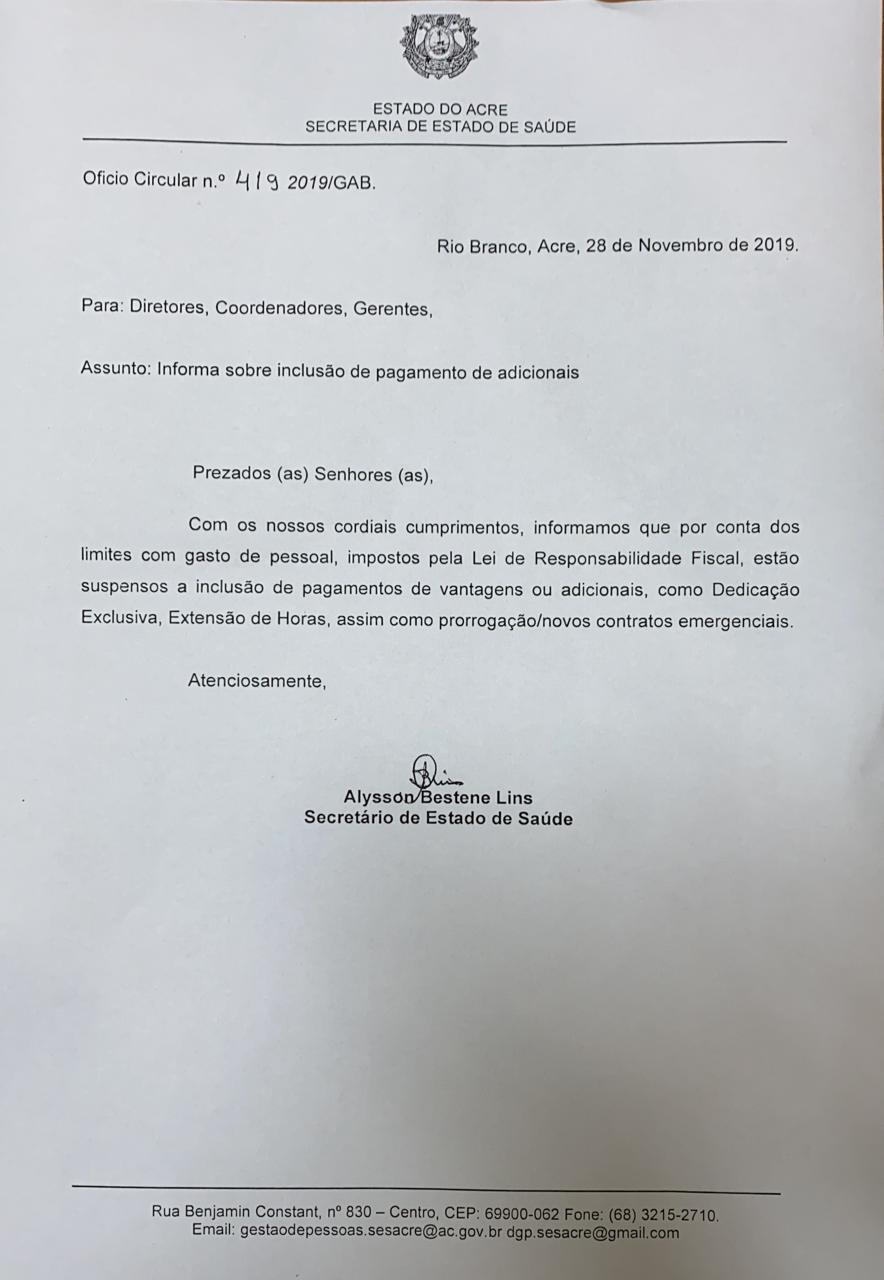 Em nota, o secretário Alysson Bestene anunciou a suspensão de alguns benefícios.Segundo o gestor, devido o Estado está no limite da Lei de Responsabilidade Fiscal, estão suspensos pagamentos de: dedicação exclusiva, extensão de horas e prorrogação de contratos emergenciais.