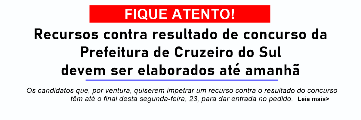 O resultado preliminar do concurso da Prefeitura de Cruzeiro do Sul e o gabarito oficial da prova foram divulgados na sexta-feira, 20.