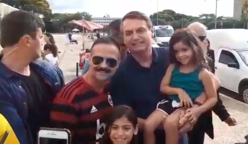 A atitude do presidente divertiu seus apoiadores, mas deixou o torcedor do Flamengo sem graça. “Que que é isso, presidente?”, disse o flamenguista, que estava junto com a filha pequena. Um dos presentes ainda tentou minimizar o clima estranho dizendo “é brincadeira dele”. Depois disso, Bolsonaro tirou uma foto com o homem que vestia a camisa do clube carioca e sua filha. Eles não falaram mais nada sobre o assunto.