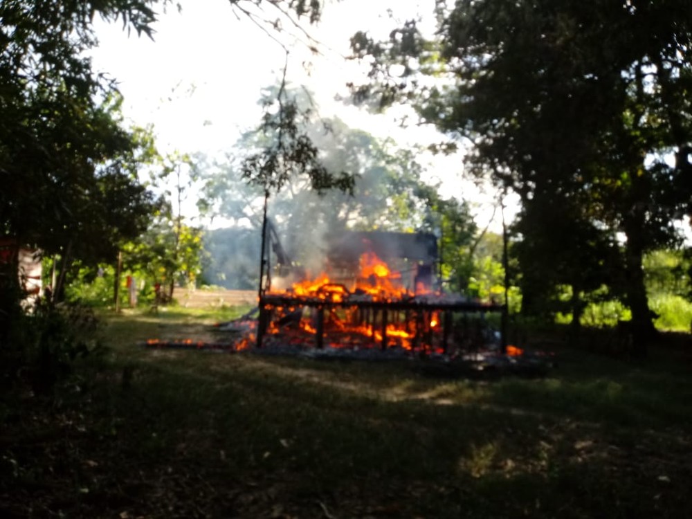 Um incêndio destruiu, na tarde do último sábado (11), uma casa de madeira, na estrada do Panorama, zona rural de Rio Branco. O casal, que espera um bebê, não estava na hora que o fogo começou.