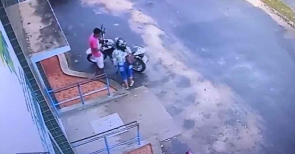 Um homem, armado, rendeu uma mulher que estava prestes a sair do local com sua motocicleta e acabou furtando a moto da vítima. Antes de agir, o homem aguarda friamente o momento ideal para render a proprietária.