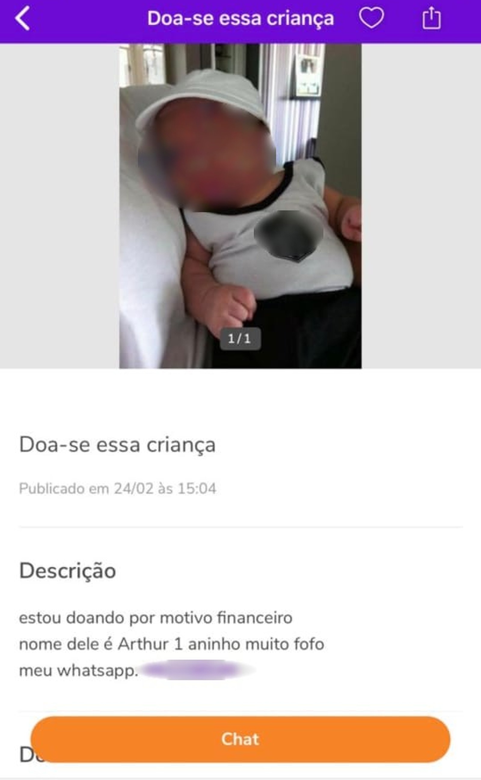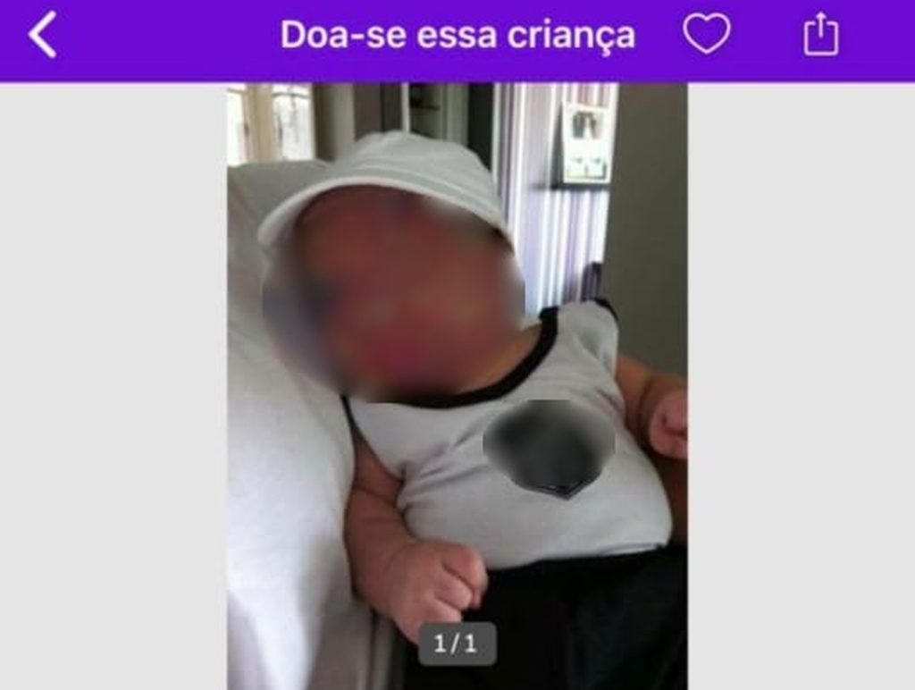 No anúncio, é possível ver que o anunciante repostou na segunda-feira (24) e alega que está dando a criança por motivos financeiros. É colocado o nome do menino e a idade, seguido de um elogio: “muito fofo”. O contato do anunciante vem logo abaixo.