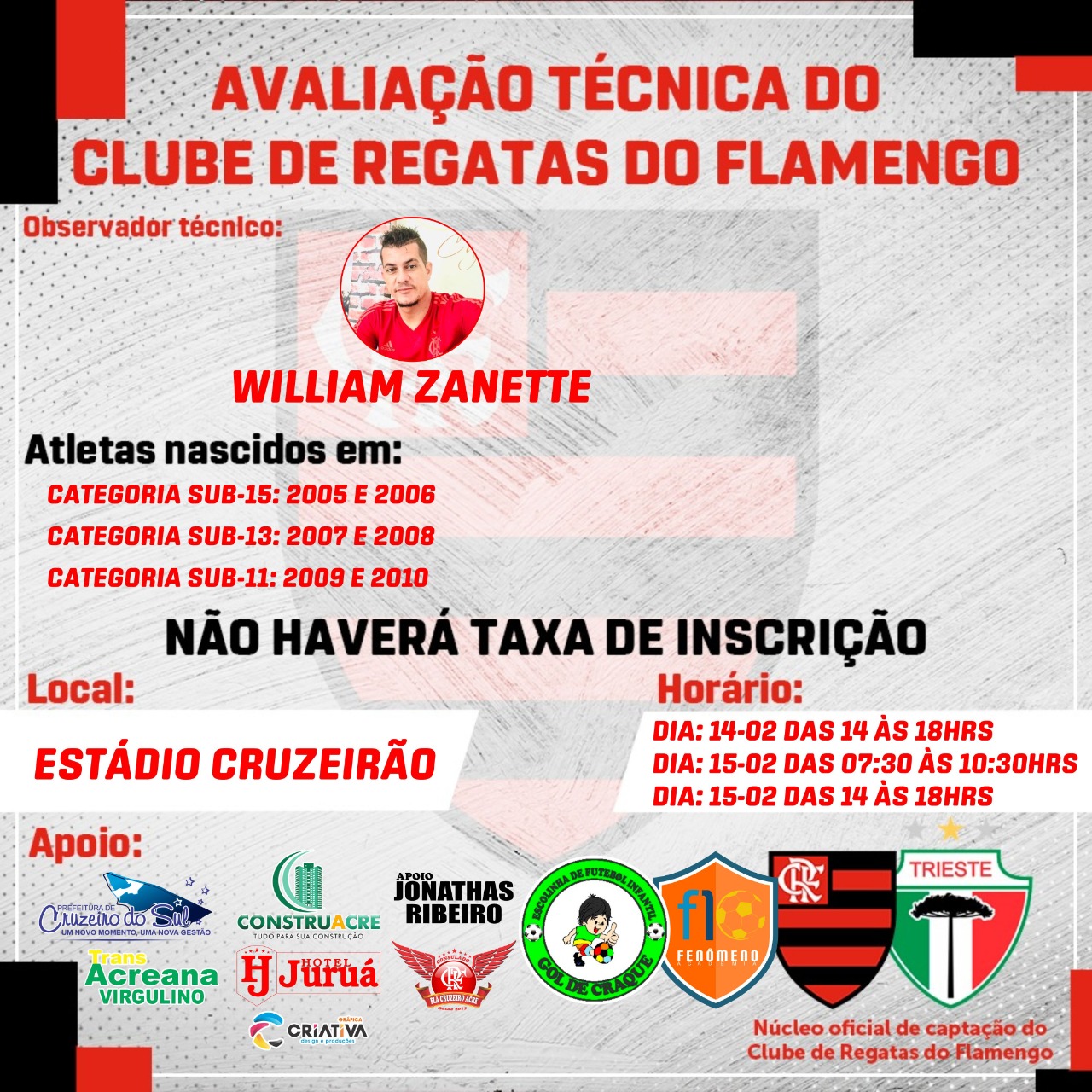 Wiliam Zanette, ex-jogador profissional e avaliador técnico do Flamengo na região Norte, estará em Cruzeiro do Sul de sexta a domingo, 14, 15 e 16, para avaliar 100 crianças e jovens de escolinhas de futebol da cidade das categorias sub 11, 13 e 15.