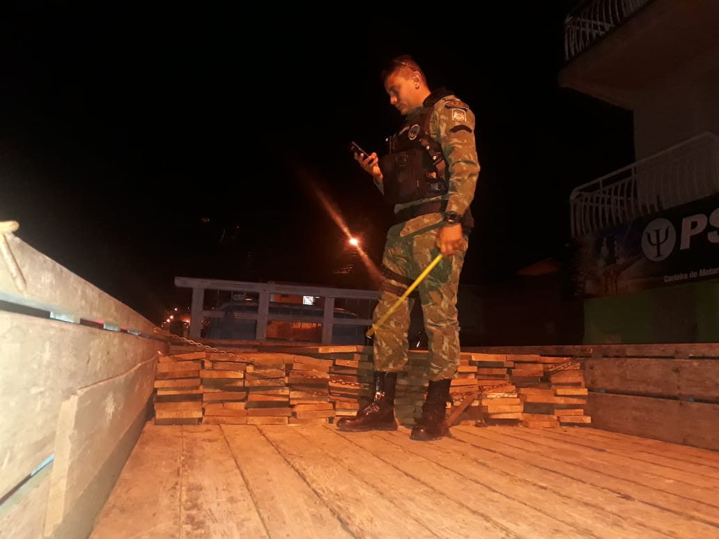 A Polícia Militar, através do 6° BPM, nesta noite de sexta feria (07/02), em patrulhamento a GU AMBIENTAL abordou um caminhão T60 Chevrolet de cor azul transportando 2,5 metros cúbicos de madeira sem DOF exigida pela lei 9.605 de 98 de crimes ambientais sendo realizada a prisão e condução do envolvido e do caminhão com a madeira para a delegacia e as demais fases do flagrante.