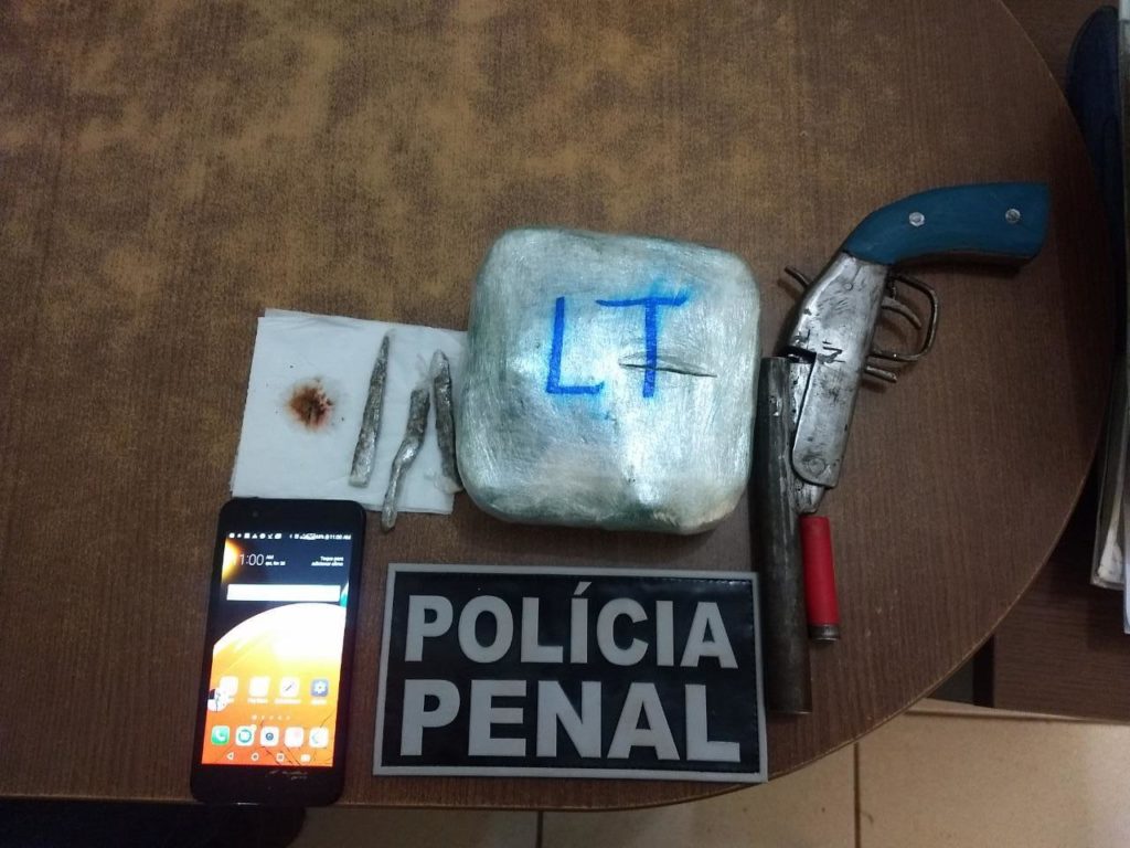 Após a denúncia, policiais penais foram até o endereço do monitorado, onde começaram uma busca minuciosa pela residência. Além de uma escopeta calibre 28 com uma munição intacta, foi encontrado também 992g de uma substância aparentando ser cocaína três barras pequenas aparentando ser maconha, pesando 4g.