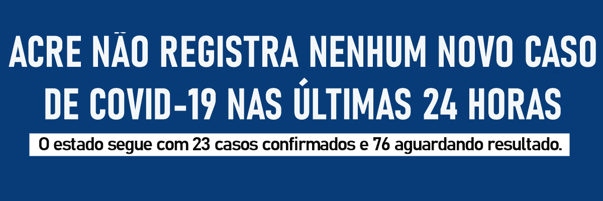 A Secretaria de Estado de Saúde do Acre (Sesacre), por meio do Departamento de Vigilância em Saúde (DVS), informa que os números de casos confirmados de contágio por coronavírus no estado continuam sendo de 23 pessoas, segundo boletim do Centro de Infectologia Charles Mérieux, em Rio Branco, nesta quinta-feira, 26.
