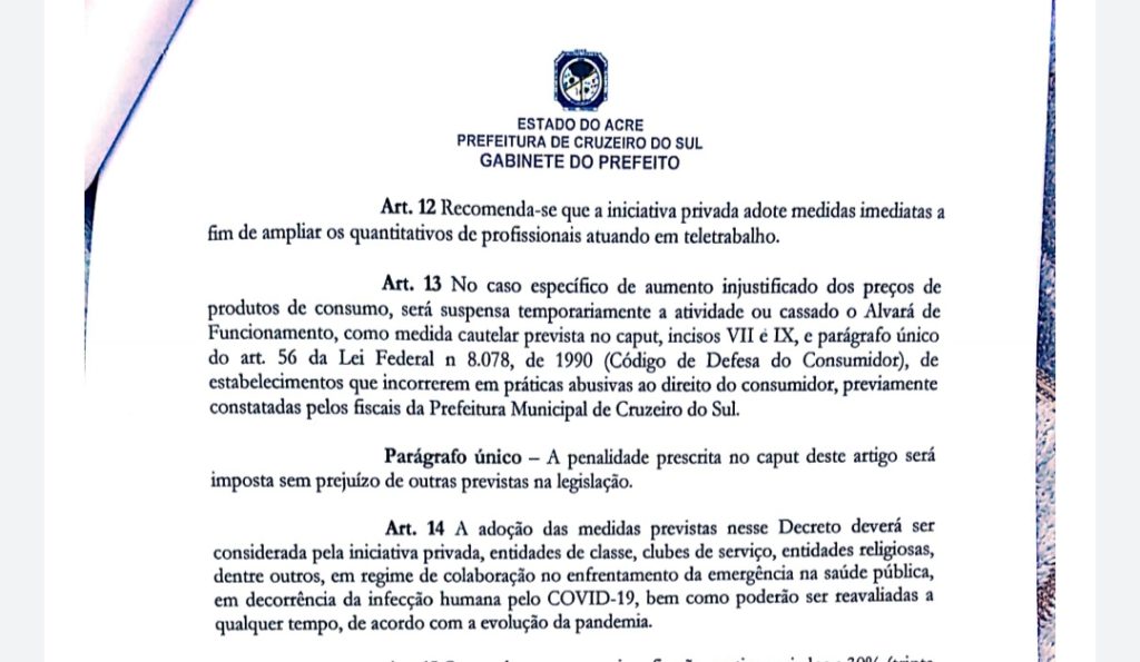 O Prefeito de Cruzeiro do Sul, Ilderlei Cordeiro, editou o decreto que impõe punições aos estabelecimentos que cobrarem preços abusivos nos produtos durante o período de quarentena ocasionado pelo Coronavírus.