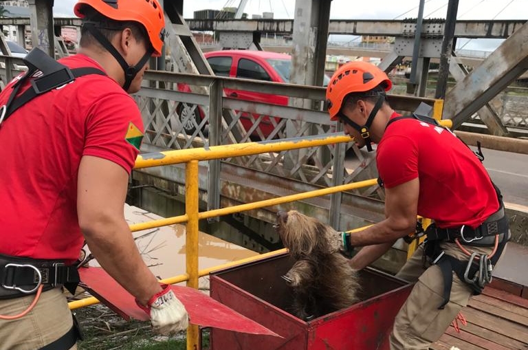 Na manhã da última quarta-feira, 4, um bicho-preguiça foi visto sendo arrastado por um balseiro acumulado dentro do Rio Acre, nas proximidades da ponte Juscelino Kubitschek. Imediatamente ao serem acionados, o Corpo de Bombeiros, utilizando a técnica de rapel, conseguiu desprender o animal e encaminhá-lo para atendimento médico.