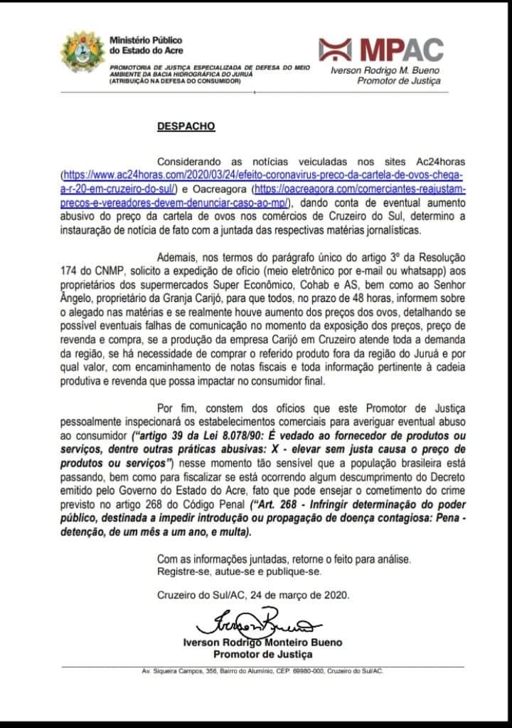 Em um despacho assinado pelo promotor de Justiça Iverson Rodrigo Monteiro Bueno, concedeu um prazo de 48 horas, para que os proprietários dos supermercados Super Econômico, Cohab e AS, bem como o Sr Ângelo, proprietário da granja carijó, esclareçam o motivo do aumento nos preços da cartelas de ovos.