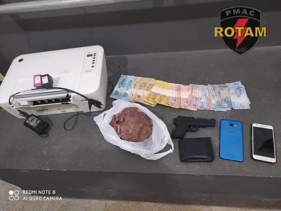 Ao questionar sobre o local, que normalmente deixa os pertences subtraídos, o detido informou o endereço e, após a autorização de entrar no domicílio, foram encontrados uma impressora, dois celulares, uma certa quantia em dinheiro onde o morador não soube informar sua procedência. Além disso, foi apreendida carne de animal silvestre.